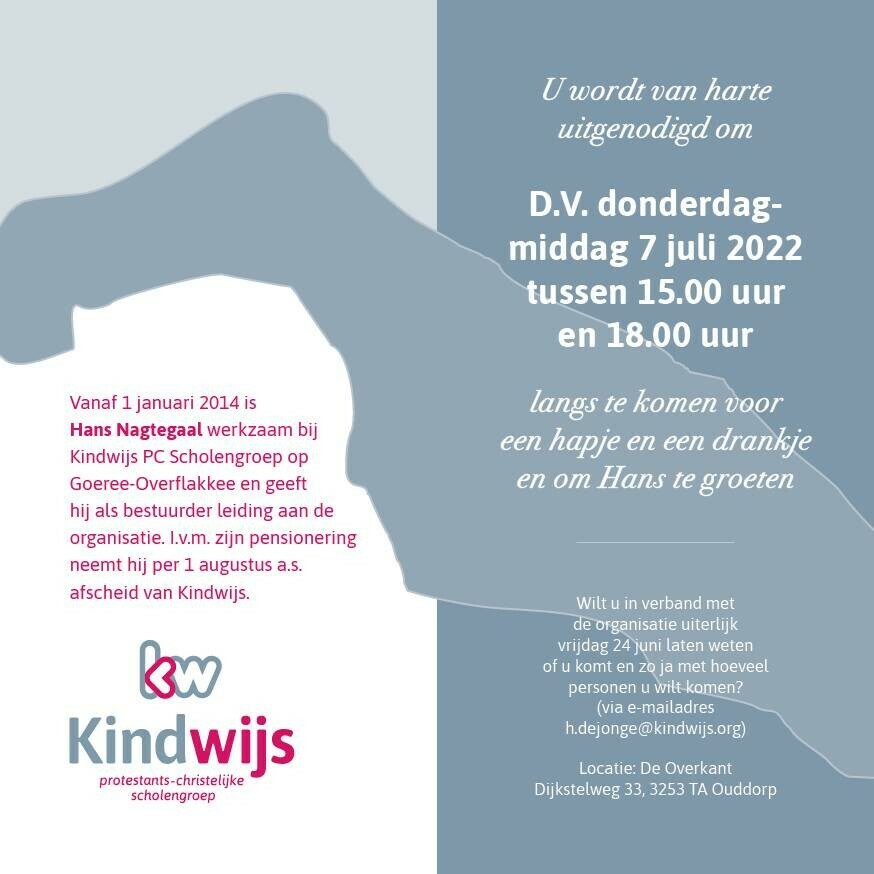 Vanaf 1 januari 2014 is Hans Nagtegaal werkzaam bij Kindwijs PC Scholengroep op Goeree-Overflakkee en geeft hij als bestuurder leiding aan de organisatie. I.v.m. zijn pensionering neemt hij per 1 augustus a.s. afscheid van Kindwijs.